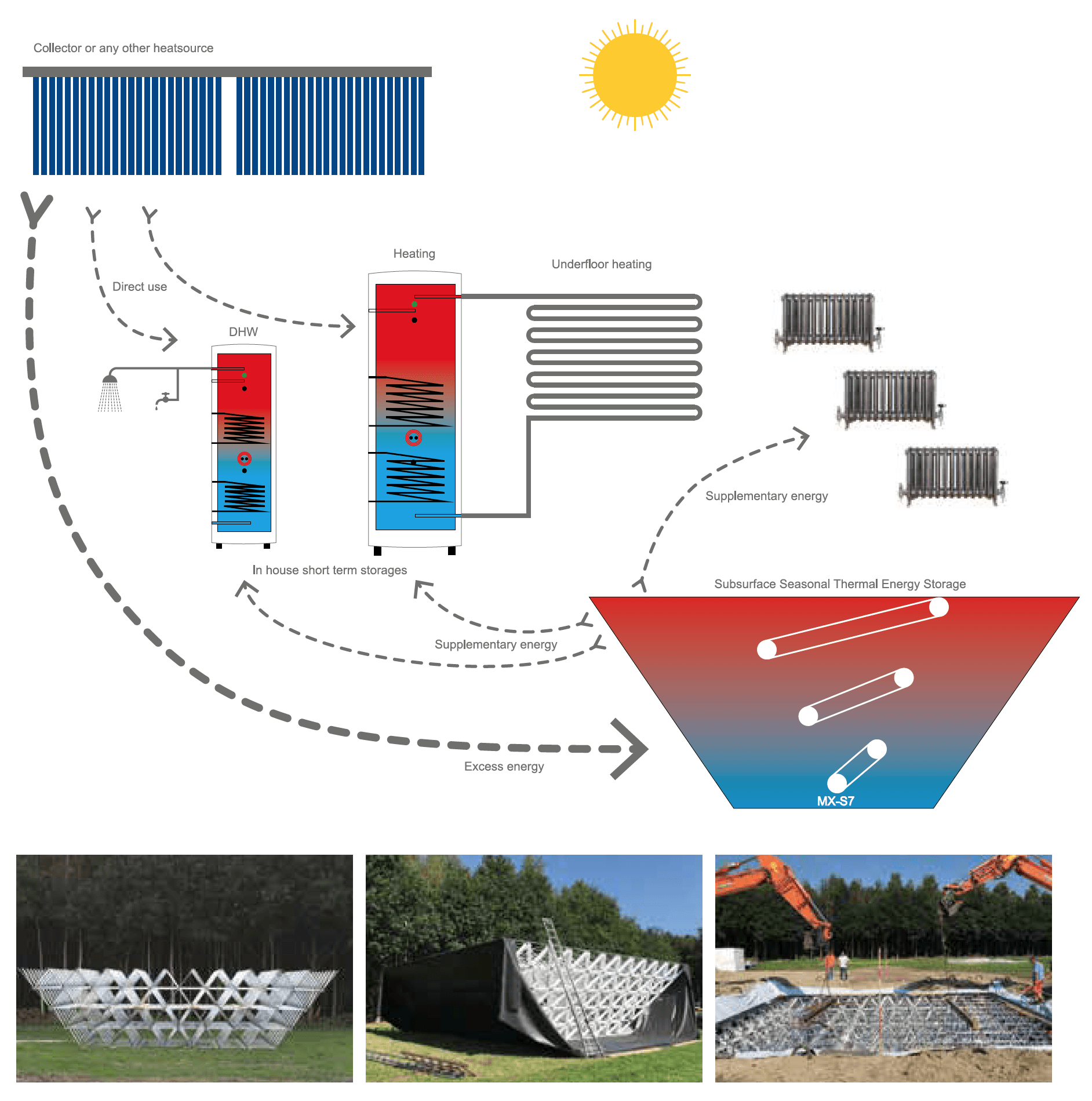 The special feature of the buffer is that the patented construction method makes it easy and quick to install. No concrete construction or reinforcement is required. This makes local and small-scale storage possible and affordable. The dimensions of the buffer are adapted to the heat demand and thus to the number of users. After covering the STES with an insulation layer and topping it off with earth, the site is functional again up to a pressure of about 5 tons. This allows the location to be used as a garden, playground or car park. The STES functions as an external boiler and is connected to the home installations.