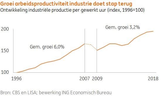 Door verregaande robotisering krijgt de productiviteitsgroei volgens ING een impuls. Van . den Brink: “Even belangrijk is het om robots en andere hoogwaardige technologie beter toe te passen. Investeringen in ‘slimme processen’ zijn van belang om doorlooptijden te verkorten en een hoog kwaliteitsniveau, een concurrerende kostprijs en dus een sterke internationale marktpositie te behouden.”