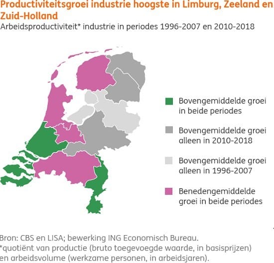 In drie provincies was de productiviteitsgroei in beide perioden hoger dan gemiddeld in Nederland. In Limburg was deze in beide perioden met 8% veruit het hoogste. Chemelot en de sterk gerobotiseerde auto-industrie in Born hebben hiervoor gezorgd. Ook Zeeland kent dankzij de chemische en aardolie-industrie een hoge productiviteitsgroei, ook al daalde de groei van 8% naar 4,5% per jaar. Deze industriële sectoren zijn ook goed vertegenwoordigd in Zuid-Holland en daardoor groeit de productiviteit ook in deze provincie sterker dan landelijk.