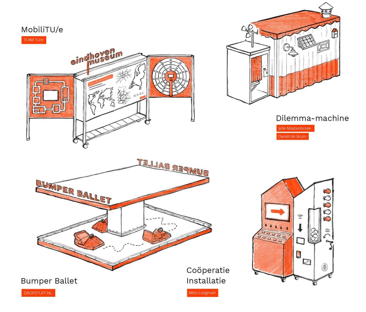Mies Loogman laat het publiek met haar Coöperatie Installatie kennismaken met een aantal innovaties die Eindhoven rijk is, zoals de elektrische fiets van Philips en de variomatic van DAF. Jelle Mastenbroek & Daniël de Bruin stellen bezoekers met hun Dilemma-machine voor de keuze tussen een hobbelige paardentram, reguliere stadsbus of vervoer per kabelbaan.
