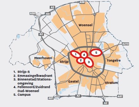 Afbeelding: vijf kansrijke gebieden binnen de rondweg Eindhoven (bron Woonvisie Eindhoven)