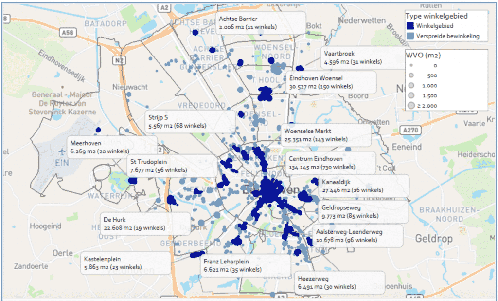 Het rapport: De winkelmarkt in de gemeente Eindhoven heeft een winkelvloeroppervlak van circa 458.900 m2 verdeeld over 2449 verkooppunten. Ongeveer 28% van de verkooppunten valt onder de categorie verspreide bewinkeling. Dit betreft winkels die solitair of in kleine concentraties liggen. Het centrum van Eindhoven is met afstand het grootste en bestaat uit 730 verkooppunten, ofwel bijna 30% van het totaal in de gemeente. Ten noorden van het centrum ligt het winkelgebied Woenselsemarkt van 143 verkooppunten, dat te boek staat als een binnenstedelijke winkelstraat. Het stadsdeelcentrum Woensel (WoensXL) is een ander groot winkelgebied en telt 150 verkooppunten. Woenselsemarkt en WoensXL zijn samen goed voor circa 12% van de totale winkelmarkt.