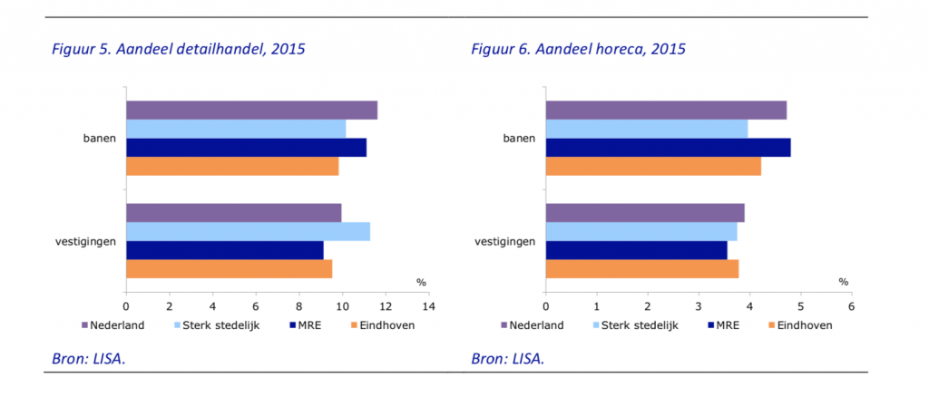Eindhoven heeft bijna 230.000 inwoners, bijna 20.000 bedrijven en instellingen en ruim 150.000 banen. Daarmee is de stad hét centrum van werkgelegenheid voor MRE. De detailhandel in Eindhoven is met 1.900 winkels goed voor ruim 15.000 banen, de 750 horecagelegenheden voor ruim 6.000 banen. In vergelijking met het aandeel dat detailhandel en horeca in MRE, sterk stedelijke gemeenten en Nederland in het aantal vestigingen en de werkgelegenheid hebben, is in beide sectoren zowel het aantal bedrijven als de werkgelegenheid klein.