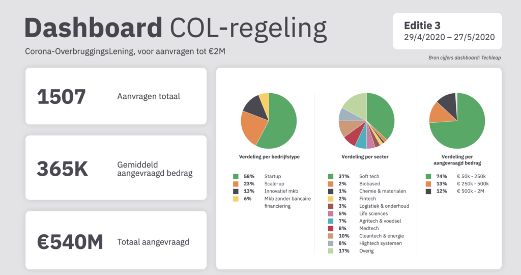 De Corona-OverbruggingsLening (COL) is één van de steunmaatregelen die de overheid heeft bedacht om kleinere, innovatieve bedrijven te helpen om door de storm van de coronacrisis te komen. De regeling is eind april opengesteld en sindsdien loopt het storm met aanvragen. Tegen de tweeduizend startups, scale-ups en innovatieve mkb-ers deden een aanvraag, in totaal voor vele honderden miljoenen euro’s. Zoveel geld zit er niet in de pot. Weliswaar verhoogde het kabinet het beschikbare bedrag van €100 miljoen naar €250 miljoen, maar ook dat zal niet de volledige behoefte kunnen dekken.