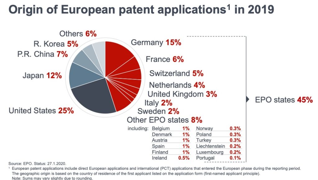 Toch is het totaal aantal Nederlandse octrooiaanvragen in 2019 met 2.6% gedaald, na twee opeenvolgende jaren van gestage groei. Met 6954 octrooiaanvragen is Nederland nog steeds het op drie na grootste land van herkomst voor octrooiaanvragen van de 38 lidstaten van het Europees Octrooibureau en neemt het wereldwijd de achtste plaats in. Aldus de vandaag verschenen EOB Patent Index.