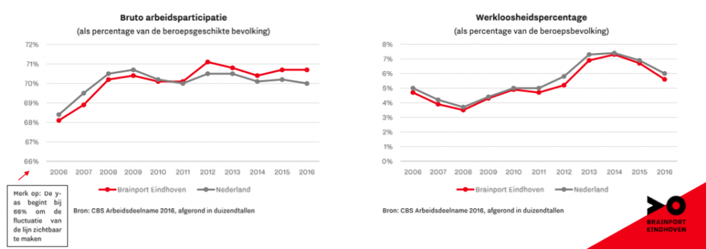 In 2016 groeit de economie met 2,8 procent tegenover 2,2 procent nationaal. Tijdens de recessie in 2012 was er zowel regionaal als nationaal sprake van een daling, maar sindsdien is de regionale economie ieder jaar harder gegroeid. Na regio Amsterdam is Brainport Eindhoven de snelst groeiende regio op economisch gebied. Beiden regio’s hebben een gemiddelde groei van 2,5 procent.