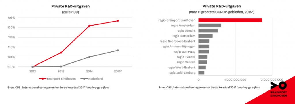De cijfers op het gebied van innovatie stijgen ver boven het gemiddelde van de rest van het land. Van alle private uitgaven aan onderzoek en ontwikkeling (research & development) komt ruim een vijfde uit Brainport Eindhoven, het gaat hierbij om 1,7 miljard euro. Het bedrijfsleven in de regio investeert hiermee veruit het meest in onderzoek en ontwikkeling. De verzuchting van Joep Brouwers, tijdelijk Brainport-directeur, gisteren: “Let wel: dat is allemaal privaat geld. Het wordt hoog tijd dat de overheid daar een voorbeeld aan neemt.”