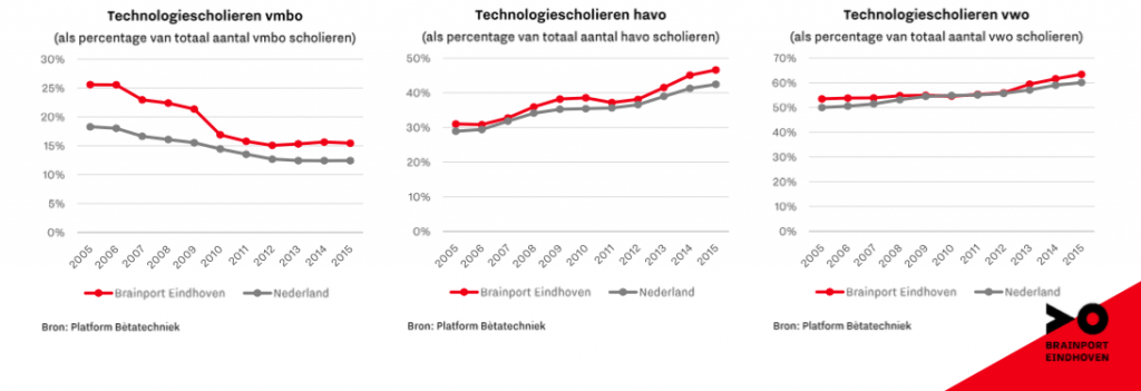 Het ziet er dus goed uit voor de steeds meer technologiescholieren in regio Eindhoven. De laatste drie jaar stijgt de keuze voor technologie door scholieren op het voortgezet onderwijs. Met name op have en vwo kiezen relatief veel scholieren voor een technologisch profiel; havo 46,6 procent, vwo 63,4 procent. Ook steeds meisjes kiezen voor dit profiel. Op het vwo zelfs meer dan de helft met 61 procent. Op het vmbo is het na jaren van daling constant, één vijfde van de ruim zevenduizend technologiescholieren op het voortgezet onderwijs zit op het vmbo. Binnen elk niveau van het voortgezet onderwijs ligt het gemiddeld aantal scholieren met een technologisch profiel boven het landelijke.