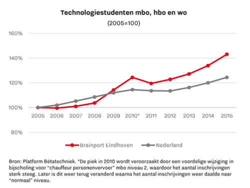 Ook bij de studenten liggen de aantallen ver boven het landelijk gemiddelde. Ten opzichte van 2005 is het aantal technologiestudenten op nationaal niveau in 2015 met 24,4 procent toegenomen tegenover 43 procent regionaal.
