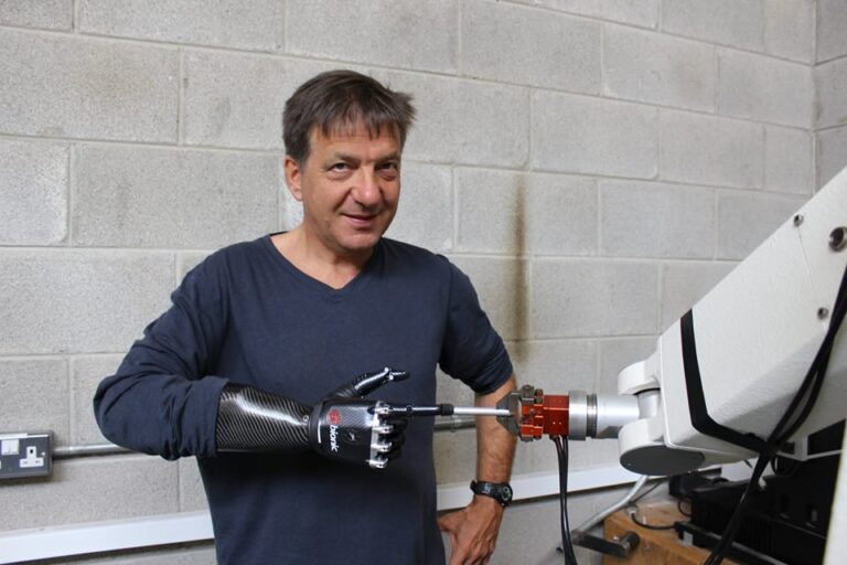 De man met de bionische hand op het podium van E52 Live!