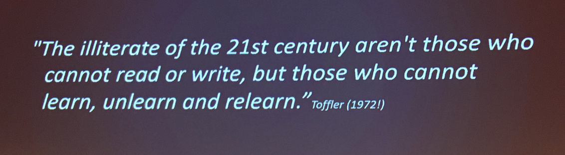 Ter illustratie van de problematiek die dat samen met de digitalisering teweeg brengt, haalde Blokhuis een uitspraak aan van een bekende Amerikaanse futuroloog, Alvin Toffler. Die stamt al uit 1972, bijna vijftig jaar geleden dus. Maar goed, Toffler was niet voor niets een toekomstvoorspeller. „De analfabeten van de 21e eeuw zijn niet de mensen die niet kunnen lezen of schrijven”, zo zei hij, „maar dat zijn zij die niet kunnen leren, afleren en weer opnieuw kunnen leren.”