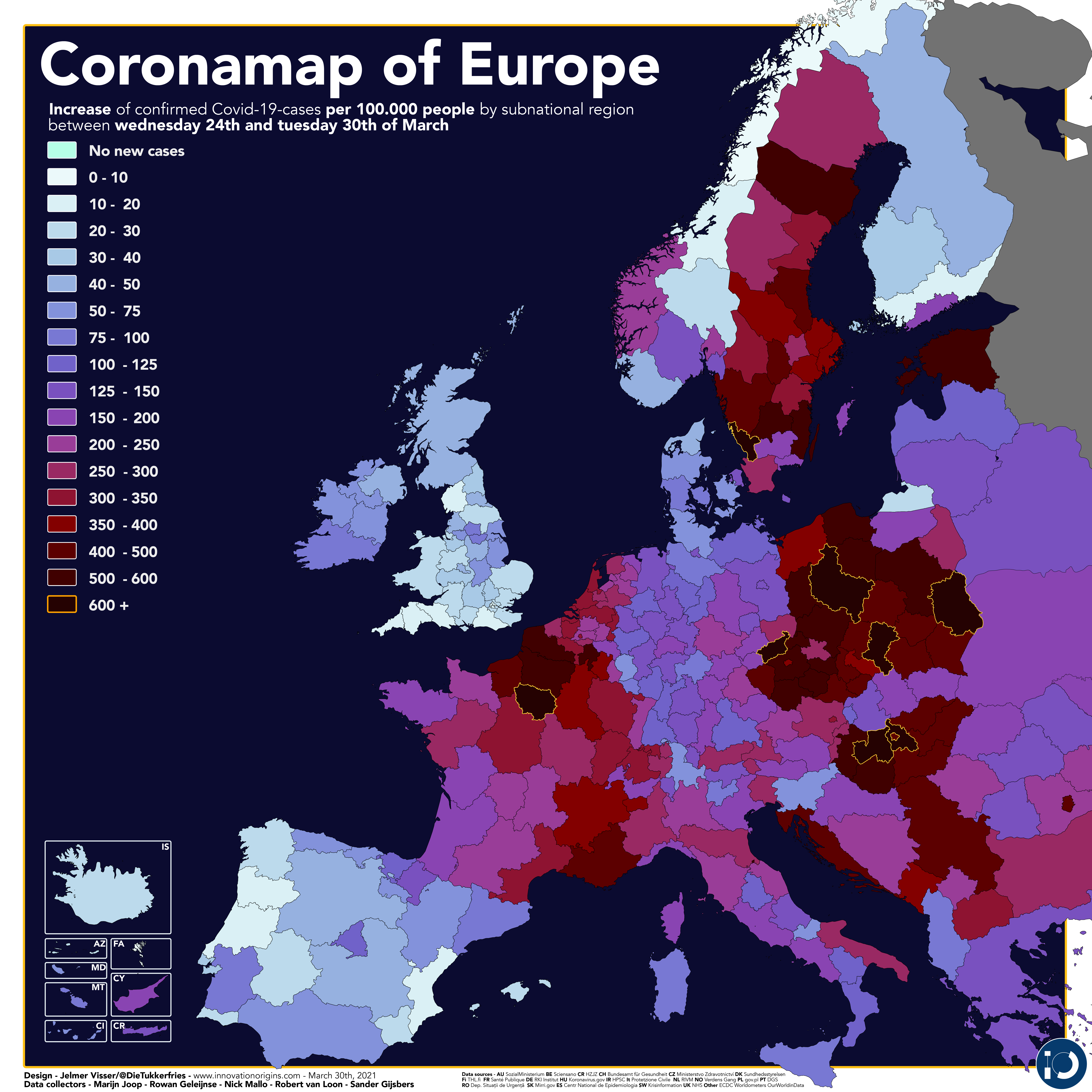 Europese coronakaarten op subnationaal niveau waren tot afgelopen najaar een vast onderdeel van deze IO-rubriek. Op deze kaarten was het onderlinge verschil en de trend in een oogopslag inzichtelijk. Omdat de cijfers nu opnieuw door het dak gaan, vond de kaartenkleier annex auteur van dienst het hoog tijd om de ‘klassieke’ kaartvariant weer van de plank te halen en in een fris jasje te steken.