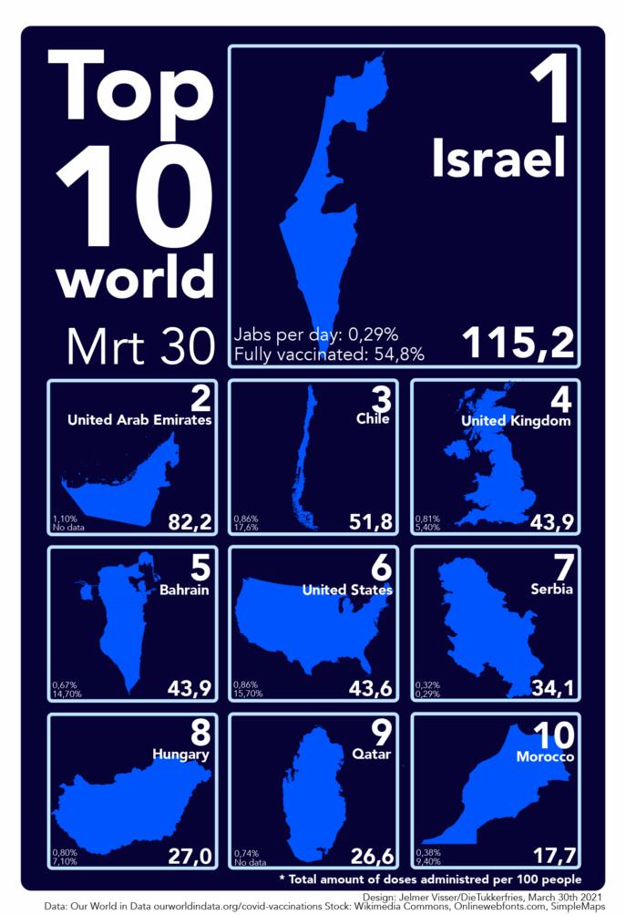 In de top 10 vallen vooral Chili en Marokko op tussen de rijke Golfstaten en het gewiekste drietal dat de hele wereld aftroefde tijdens de inkoopfase die uitmondde in een zenuwslopende farmaceutensoap die nog altijd niet voorbij is.