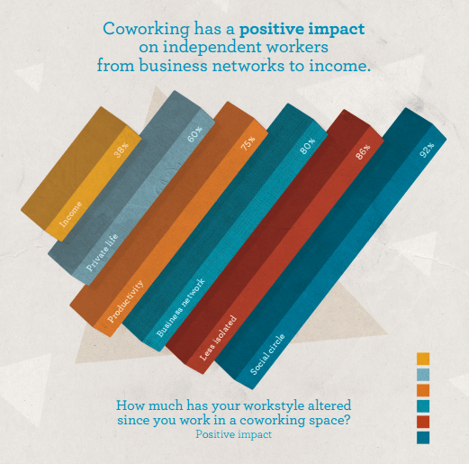 ‘Members’ geven zelf aan dat ze gemotiveerder en productiever zijn dan wanneer ze vanuit thuis of een koffietentje werken. Ook hebben ze meer direct contact met mensen en werken ze vaker in een team. Zo blijkt uit onderzoek van Deskmag. De isolatie tegengaan mag dan een cliché zijn maar het is wel een van de voordelen die het coworken biedt.