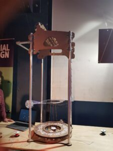 Achter de in het rond crossende robot staat een imposant apparaat. Verschillende ronddraaiende tandwielen en draden vormen een groot geheel. Rick Koelewijn legt uit dat het apparaat in de toekomst designnetwerkkabels moet maken. Het is een mix tussen een vlecht- en een kantklosmachine. “Uiteindelijk zal deze zorgen voor netwerkkabels die niet meer verstopt hoeven te zitten in de meterkast, maar als een designelement in de woonkamer aanwezig kunnen zijn.” De techniek bestaat op dit moment nog niet en is dus helemaal door deze drie jongens ontwikkeld. “We hebben eraan gewerkt tijdens onze stage. Vandaag zijn alle elementen samengekomen tot het geheel dat het nu is,” vertelt Koelewijn.