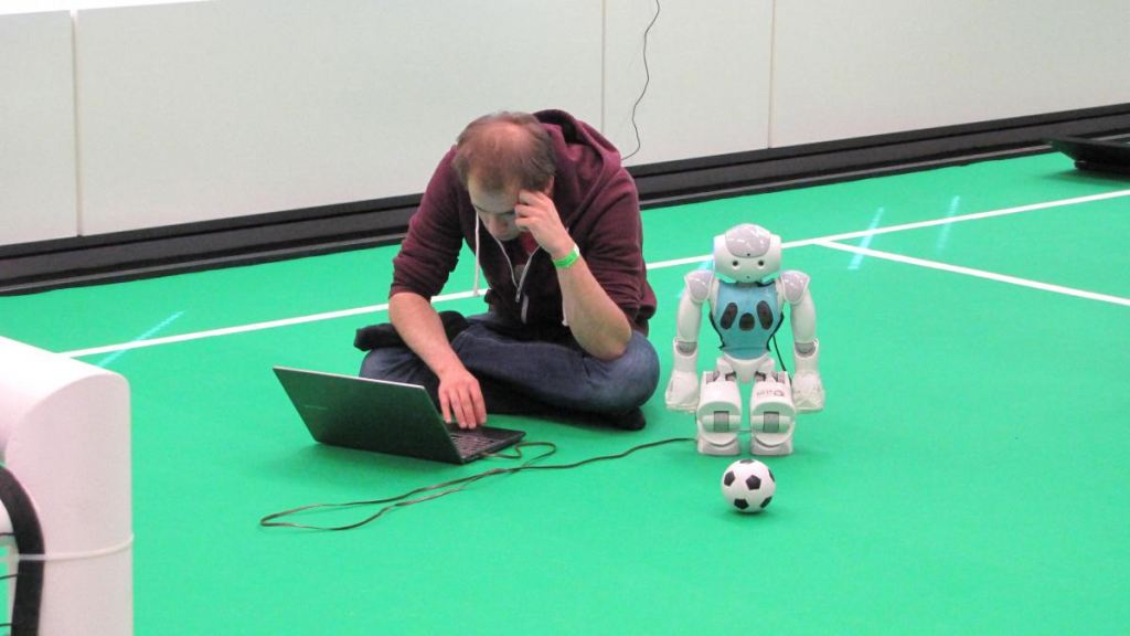 Even verderop, bij de Standard Platform League, probeerden de schattige humanoid Nao robots om te schieten en te scoren, al ging dit nog met vallen en opstaan. Het is de komende dagen ook zeker de moeite waard om hier een kijkje te nemen. Het grote spektakelstuk gaat zich natuurlijk afspelen in de Middle Size League (MSL), in de tent naast het Evoluon. Hier waren de teamleden van de verschillende teams vandaag uiteraard erg gefocust om hun robots zo goed mogelijk te optimaliseren. Eindhovens eigen team Tech United hoopt natuurlijk de hoofdprijs te pakken en de Portugese concurrent te verslaan. De eerste MSL wedstrijd zal donderdag een Eindhovens onderonsje zijn: om 10:00 uur speelt Tech United tegen VDL Robot Sports. (UPDATE: Tech United won met 15-0)
