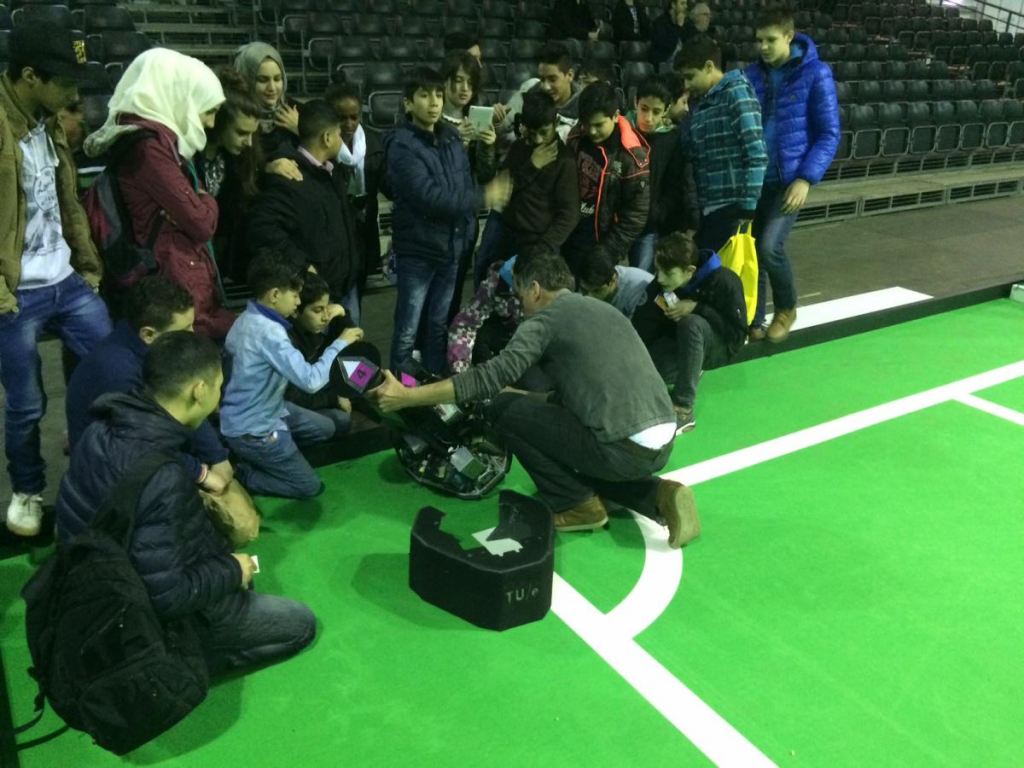 Net zoals gisteren waren er ook vandaag weer verschillende groepen schoolkinderen, die werden rondgeleid op de RoboCup. Hieronder vandaag een groep asielzoekerskinderen vanuit het Stedelijk College in Eindhoven. Zij kregen onder andere uitleg bij de robots van de Mid Size League, waarbij verteld werd wat er nu eigenlijk precies gebeurt op het veld en wat er allemaal bij komt kijken. Uiteraard kon ook een foto met bij de populaire muziekrobots van Kolja Kugler niet ontbreken.