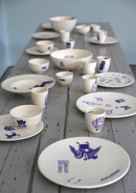 Voor de KOM-lijn werkte Social Label samen met Cello, zorgaanbieder voor mensen met een beperking, en Demarrage (Reinier van Arkel), voor mensen met psychische aandoeningen. Grafisch vormgever Edwin Vollebergh (Studio Boot) ontwierp aan de hand van interviews met de makers speciale “tattoo’s”, waarmee een persoonlijk servies werd gemaakt. Elk bord en elk kopje vertelt zijn eigen, vaak heftige, levensverhaal. Zo is er het plaatje van de rolstoel met vleugels, ontworpen aan de hand van het verhaal van Jolinda die door een zenuwziekte beiden benen verloor. “Het maken van een servieslijn met hun persoonlijke verhalen gaf erkenning en hielp de makers ook een beetje bij het verwerken van hun verdriet.” Sommigen noemden het beter dan therapie, vertellen Kramer en Janssen.