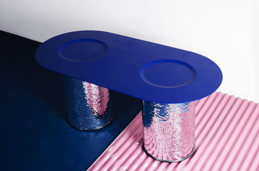 Zoals bij Job van den Berg bijvoorbeeld.”Hij gebruikt een vrij exclusieve techniek in Nederland; de rubberpers. Door op onconventionele manier om te gaan met de machine heeft Job bijzondere structuren in metaal weten te persen.” Zijn onderzoek mondde uit in het maken van twee salontafels.