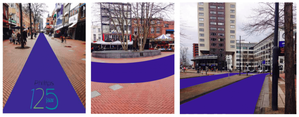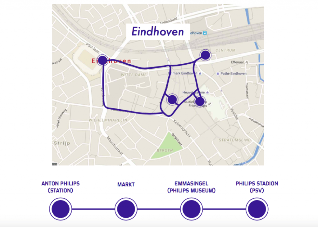 De blauwe loper begint bij het station en brengt de bezoeker van daaruit langs alle grote herkenningspunten van Philips in de stad. Tijdens een wandeling worden diverse Philips-locaties aangedaan; van de standbeelden van Anton en Frits Philips en het voormalig woonhuis van Anton Philips tot en met het Philips Museum, het Evoluon en het Philips Stadion, thuisbasis van PSV. Groepen uit de stad met een ʻPhilips-verledenʼ (sport, muziek, historie) worden uitgenodigd langs de route wat te laten zien of horen. Ook de binnenstadsondernemers dragen hun steentje bij.
