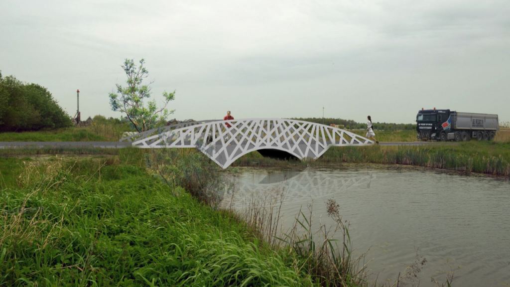 Eerder dit jaar maakte de TU Eindhoven bekend ’s werelds eerste 3D geprinte betonnen brug te gaan bouwen. Volgende week moet het resultaat in Gemert zichtbaar worden. Maar blijkbaar is dat nieuws aan de provincie Groningen voorbij gegaan, want daar werd vandaag bekendgemaakt dat in Blauwestad binnenkort de “eerste geprinte verkeersbrug voor autoverkeer ter wereld” wordt aangelegd.