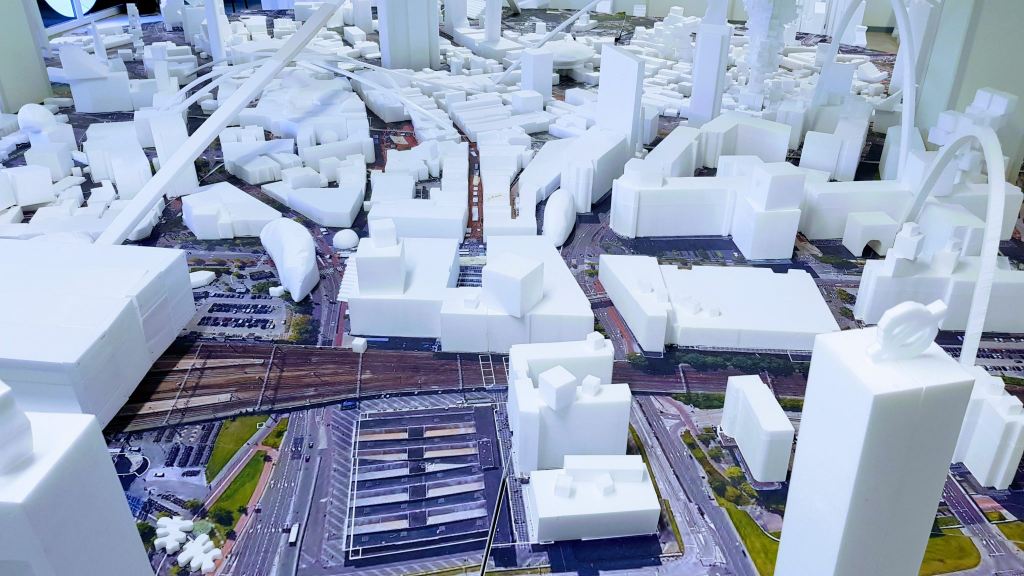 “Deze ruimte is tijdelijk, maar we willen graag zo snel mogelijk een soort winkel hebben waar we mensen kunnen uitnodigen te spreken met elkaar en waar we kunnen proeven wat de inwoners willen. Er werd mij al gevraagd ‘Wa bende aan het doen?’. De winkel moet dat nog duidelijker gaan maken. Wat je hier op de maquette niet ziet zijn de groene dip (daktuinen e.d.), de vloerbedekking en het distributiesysteem. Wat we gedaan hebben is dat we hebben gekeken met de studenten, waar gaat het eigenlijk om? Het vraagstuk is hoe we die 20.000 mensen die erbij komen in de binnenstad gaan huisvesten. Dit zijn expats en interne verhuizingen binnen Eindhoven. Wat kun je dan doen? 10.000 huizen bouwen, 1000 per jaar, maar je kunt het ook uitdrukken in torens: in één toren van 900 meter hoogte, dan ben je in één keer klaar. Daar zitten nog wat haken en ogen aan, maar wie weet kan het, met een mooie markthal eronder,” zeg Maas met een knipoog. “Maar we kunnen ook kijken naar torens van Rotterdams formaat, van zo’n 100 tot 150 meter hoogte. Dan heb je genoeg aan 20 torens en met lagere torens bouwen we op 40 plekken. Maar wat levert dat nou op? Daar hebben we met ABN Amro aan gerekend. Als we een investeringsfonds zouden maken, zouden die nieuwe woningen tussen 280 en 350 miljoen euro kunnen opleveren, grof berekend. Daar zou je de hele Vestdijk van kunnen ondertunnelen. Of aanpassingen aan het station en spoor kunnen doen zodat de TGV hier kan stoppen of investeren in sociale woningbouw.”