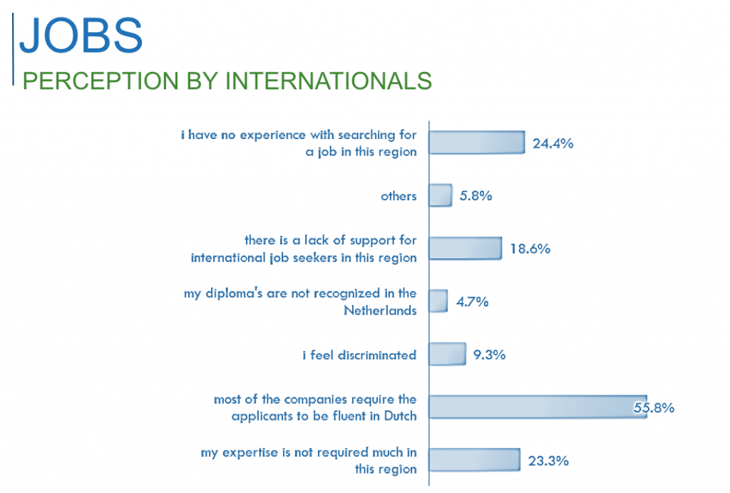 Werk is doorslaggevend voor de tevredenheid van de international. Daarbij is het niet genoeg als een van de partners van een gezin werk heeft, zo blijkt. Werk is bij uitstek de methode om te aarden in de nieuwe omgeving; zonder werk is dat lastiger. Sterker nog: over een periode van vijf jaar ligt de kans 20% hoger dat expats terugkeren naar huis als hun partner geen werk kan vinden.
