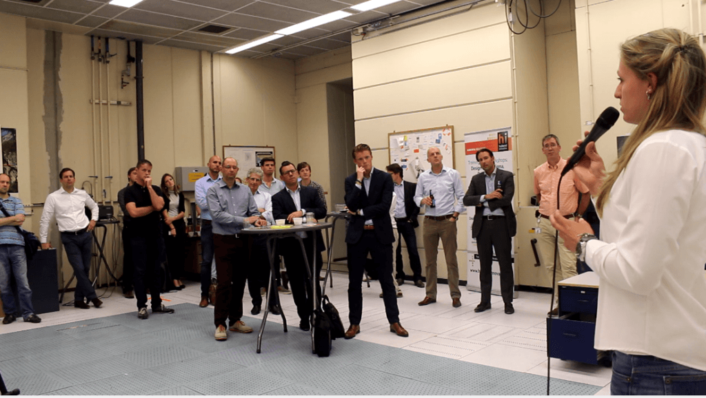 Er zijn ongeveer dertig geïnteresseerden aanwezig in High Tech XL Plaza, HTC 12. Waar in een vergaan tijdperk nog een cyclotron van Philips Research stond, staan nu mensen geboeid te luisteren naar de pitches van vanavond. Presentaties van onder andere Sensus, een studententeam van de TU/e dat een studentencompetitie organiseert voor de ontwikkeling van biosensoren. Dit weekend doen er vijf teams mee aan de competitie. Het plan is dat er volgend jaar al minimaal tien (internationale) universiteiten meedoen en een deel van het programma plaatsvindt op de High Tech Campus. “Dan is het alvast goed om een keertje kennis te maken.” zegt Tamar van Asch, student biomedische technologie en communicatie bij Sensus.