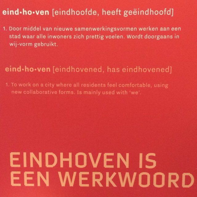 juiste woonomgeving en hoe integreren nieuwkomers? Hoe zij dit doet is te zien tijdens de DDW, in het stadhuis. En niet alleen te zien, alle bezoekers kunnen direct meepraten, meedenken en mee ontwerpen. Eindhoven is zelfs omgedoopt tot een werkwoord. “Ik Eindhoof, jij Eindhooft en het wordt leuker als we het samen doen: wij Eindhoven”, grapt Mieke Fiers, van sociaal ontwerpbureau Tante Netty die de vormgeving van de expo voor haar rekening nam.
