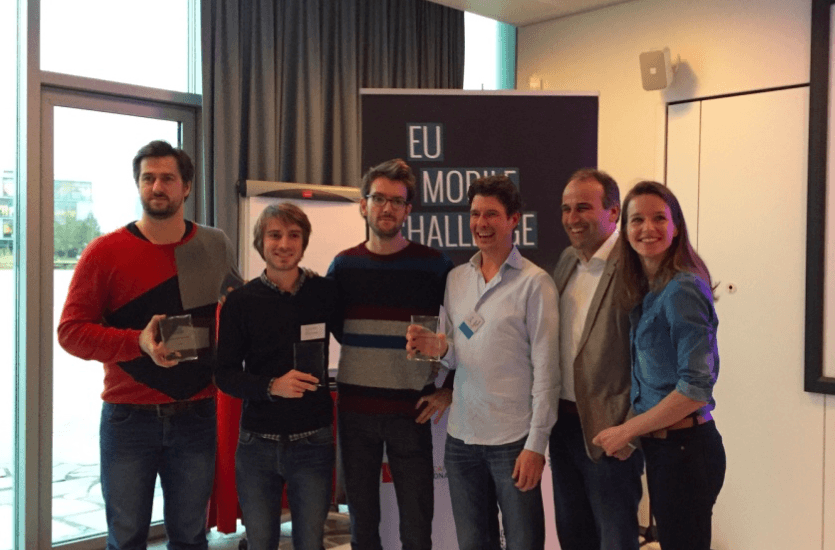 De drie winnende teams van de EU Mobile Challenge. Uiterst rechts de drie teamleden van Whatson Planner.
