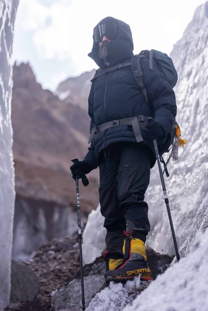“Leonardo heeft bewezen dat ons materiaal je onder hele extreme temperaturen warm kan houden. Het heeft veel voordelen ten opzichte van andere materialen. Toen het donzen jack van een van zijn reisgenoten kapotging, vlogen de veren in het rond. Er bleef niks van de jas over. Daarnaast is ons materiaal heel ademend. Het houd je warm, maar je gaat er niet van zweten.”