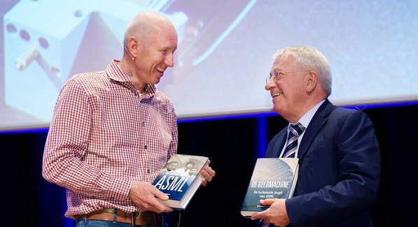 Komende week verschijnen twee boeken over ASML van René Raaijmakers. Raaijmakers ging op zoek naar de wortels van ASML’s succes. Hij beschrijft de tijd dat op het Philips Natlab de eerste uitvindingen voor chiplithografie werden gedaan, tot en met de beursgang van ASML. Wim van der Leegte nam afgelopen week het eerste exemplaar in ontvangst tijdens de boeklancering in het Evoluon.