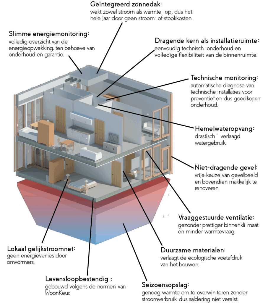 Warmteopslag is volgens Mourisse een oplossing voor een groeiend probleem. “De zonnepanelen op daken van huizen wekken in de zomer veel stroom op. Dat kunnen we tot op zekere hoogte terug leveren aan het elektriciteitsnet, maar daar zitten grenzen aan”, legt hij uit. “Als iedereen tegelijk energie wil terug leveren, dan moeten de netten aangepast worden. Dat is heel duur.” Daarom hebben de studenten het huis zo ontworpen dat het de eigen opgewekte energie op kan slaan in het water.