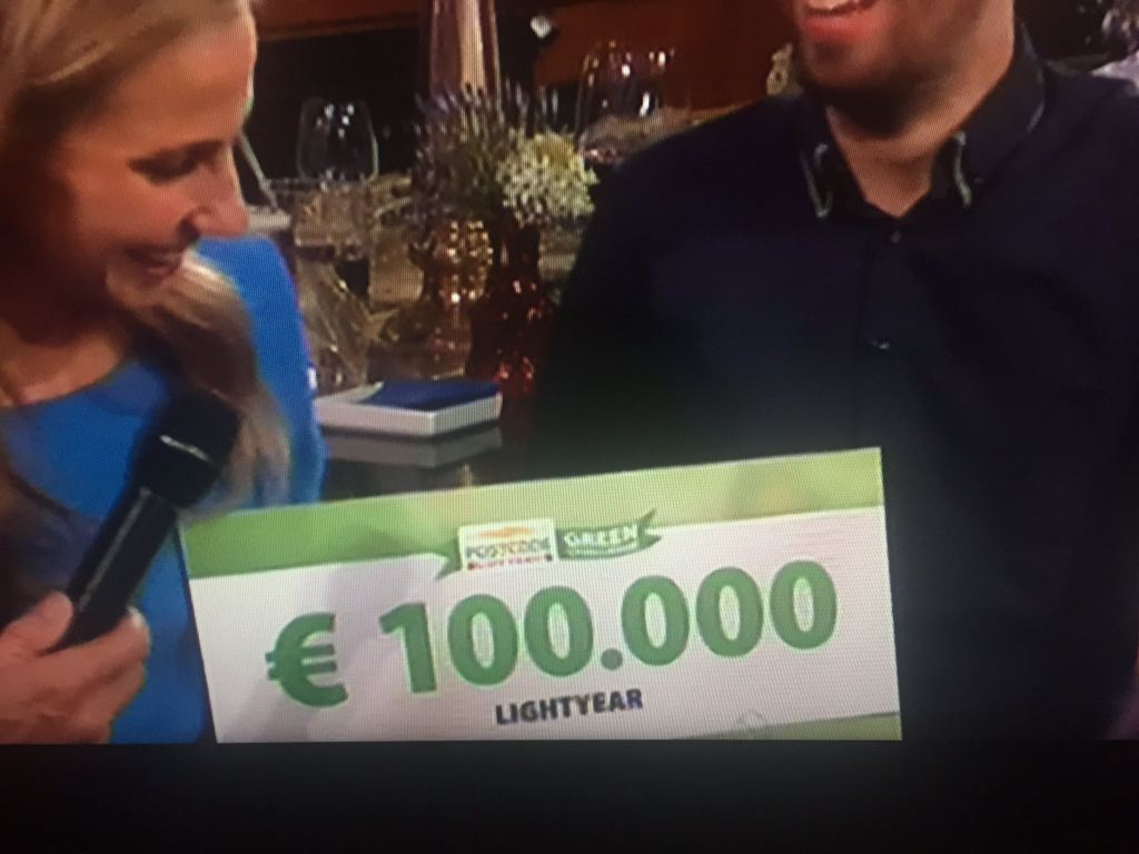 Vertegenwoordigers van de Postcodeloterij verrasten Lightyears Arjo van der Ham en Tessie Hartjes maandagavond met een cheque van 100.000 euro. Als deelnemer an de Green Challenge kan dat bedrag voor Lightyear zelfs nog oplopen tot 500.000 euro. Het team neemt het tijdens de finale op 14 september op tegen vier andere groene start-ups: ARED en EarthEnable, beiden uit Rwanda, Glowee uit Frankrijk en Pond uit Denemarken. Tijdens de finale wordt bekend wie naar huis gaat met de hoofdprijs van een half miljoen euro. De Postcode Loterij organiseert jaarlijks de wedstrijd om groene innovaties een boost te geven.