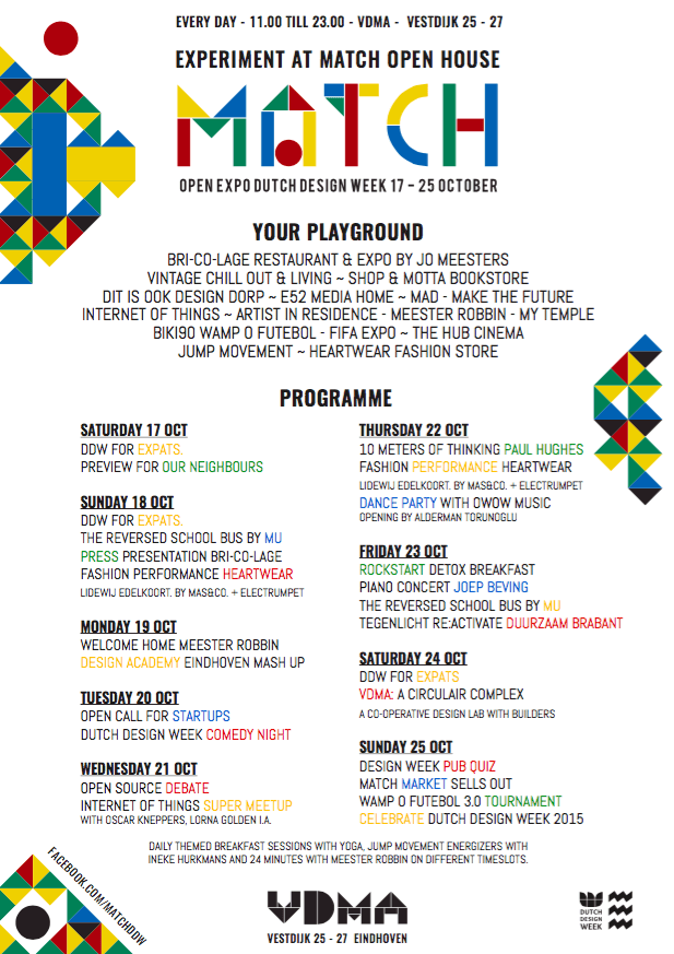 Kom ook langs bij MATCH en maak onder meer kennis met Jo Meesters & Jeanne van Beers, Niels en René Bakkerus (Biki90), Siem Nozza (DIT), René Paré (MAD), Oscar Kneppers (Rockstart) en Paul Hughes (Ten Meters of Thinking). Ook Burgemeester Rob van Gijzel, Wethouder Yasin Torunoglu en veel meer interessante en betrokken gasten zijn tijdens DDW aanwezig op de VDMA. Lees hieronder het hele programma.