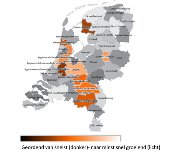 Wat opvalt aan de tien snelst groeiende regio’s is hun ligging; het zijn voornamelijk regio’s aan de A2-as. Dat bevestigt dat de grootstedelijke regio’s Amsterdam, Utrecht, Den Bosch en Eindhoven de economische ruggengraat van Nederland vormen. De groei in deze andere A2-regio’s (tussen 2,7-2,9 %) bleef net iets achter bij die van Brainport.