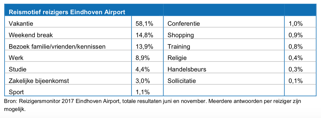 Bijna driekwart van de passagiers vliegt vanaf Eindhoven vanwege een vakantie of weekendbreak. Zo’n 12% heeft zakelijke reisdoelen. Eindhoven Airport is in tien jaar tijd drie keer zo groot geworden in termen van het aantal passagiers en ruim verdubbeld in het aantal vliegtuigbewegingen. In 2017 handelde de luchthaven zo’n 5,7 miljoen passagiers af. Er zijn meerdere passagiersprofielen te onderscheiden die allemaal zorgen voor de huidige economische betekenis van de luchthaven. Uit het onderzoek: