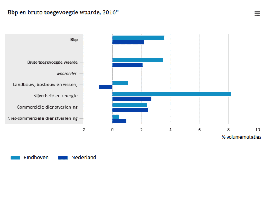 De bruto toegevoegde waarde van Eindhoven overschreef voor het eerst de grens van dertien miljard euro en was 3,5 procent hoger dan in 2015. Hieronder verstaan we alles wat binnen de gemeente is geproduceerd minus elders ingekochte goederen en diensten. De sector nijverheid en energie zijn met name verantwoordelijk voor de groei, de toegevoegde waarde nam toe met 8,2 procent. In Nederland groeide deze sector met 2,7 procent. De sector commerciële dienstverlening staat nagenoeg gelijk aan de groei in de rest van Nederland. De niet commerciële dienstverlening (zorg, overheid en onderwijs) en de landbouwsector groeiden minder sterk dan het Nederlandse totaal.