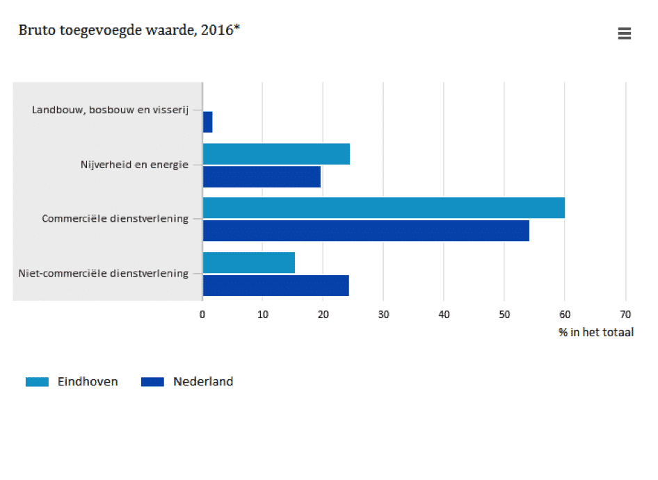 De sector commerciële dienstverlening draagt relatief het meeste bij aan de bruto toegevoegde waarde van zowel Nederland als Eindhoven. Binnen Eindhoven gaat het daarbij om zestig procent van de totale waarde. De sterk groeiende Nijverheid en energiesector maakt in Eindhoven een groter deel uit van de economie dan in Nederland. In Nederland maakt juist de niet-commerciële dienstverlening een groter deel uit dan in Eindhoven.