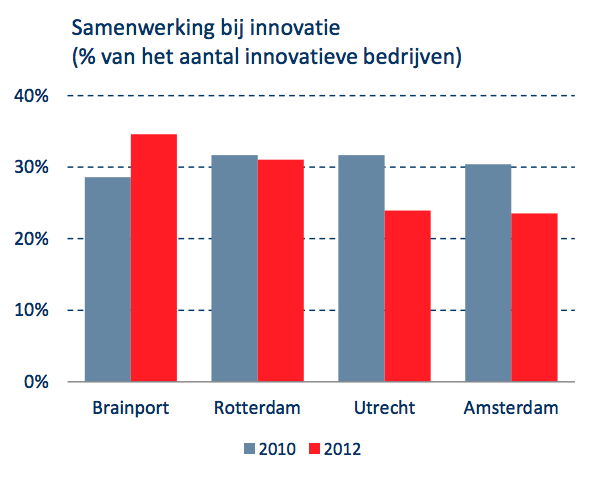 Dat er meer wordt samengewerkt op het gebied van innovatie, is niet vreemd als je kijkt naar het belang van innovatie in de regio. Bedrijven in Brainport haalden in 2010 maar liefst 43% van hun omzet uit de verkoop van innovatieve producten. Dat is een aanzienlijk groter deel dan bedrijven in Amsterdam (12%) en Rotterdam (11%). Het verschil met Utrecht is kleiner (daar is het 29%). Cijfers van na 2010 zijn niet beschikbaar.