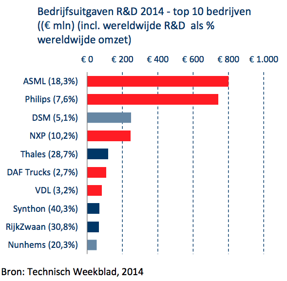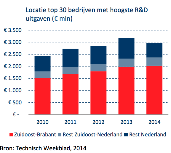 Investeringen in Research & Development, een typische indicator voor het belang van innovaties, zijn in de regio Eindhoven ook buitengewoon hoog. In totaal gaven de Nederlandse top 30 R&D-bedrijven in 2014 € 2,95 miljard aan R&D uit; meer dan tweederde hiervan (68%; ofwel € 2 miljard) werd besteed door bedrijven gevestigd in deze regio. Van de top 7 bedrijven kwamen er vijf uit de regio. De nummer 1 (ASML) besteedde in 2014 € 800 miljoen, € 25 miljoen meer dan een jaar eerder. Bij de nummer 2 (Philips) krompen de bestedingen met € 40 miljoen minder.