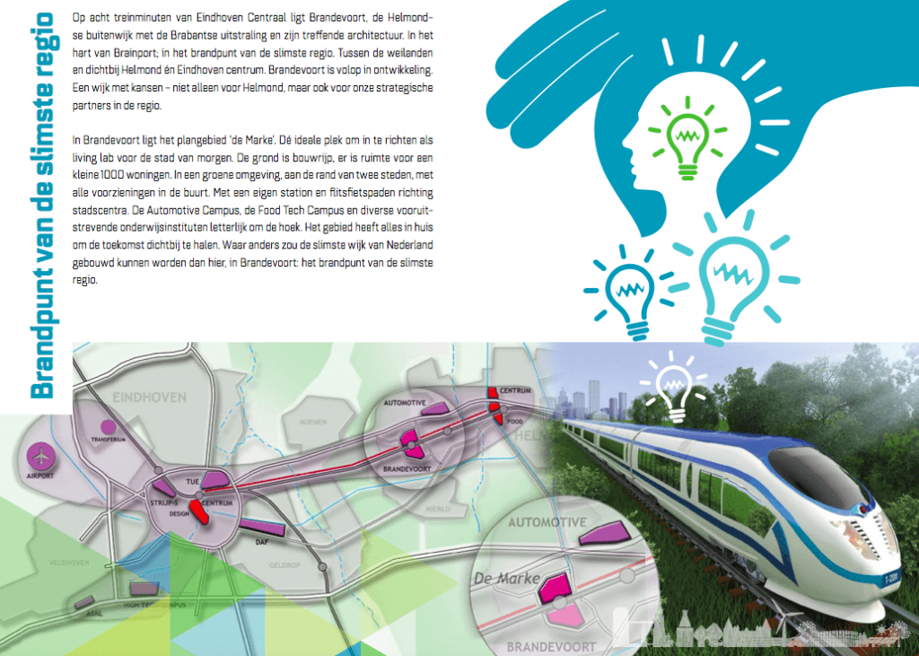 Brandevoort is een Helmondse buitenwijk. Het nog te ontwikkelen deel ervan – De Marke, aan de noordzijde van het spoor – is na twee dagen vergaderen met vertegenwoordigers van de vijf grote Brabantse steden gekozen als plek voor een living lab voor de stad van morgen. In een groene omgeving, aan de rand van Helmond en Eindhoven, met een treinstation en flitsfietspaden richting stadscentra. De Automotive Campus, de Food Tech Campus en diverse kennisinstellingen letterlijk om de hoek.