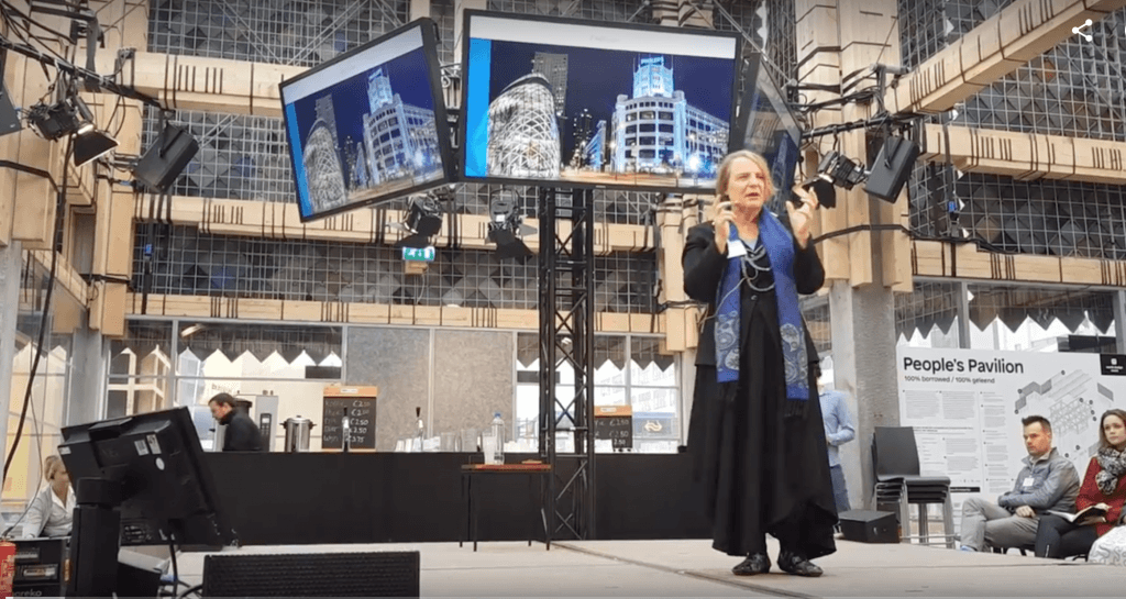 Mary-Ann Schreurs, wethouder voor onder meer innovatie en cultuur in Eindhoven, zorgde voor een van de zes stadsvoorbeelden in het People’s Pavillion. Ze deed een krachtig pleidooi om design thinking te gebruiken in de stadsplanning. “Brengt een smart city de oplossing voor alles? Nee. Dat is alleen maar gebaseerd op het neoliberale economische model, waarbij je als burger alleen maar geld kunt creëren voor 5 Californische bedrijven.” Bekijk haar complete speech in de video (15 minuten):