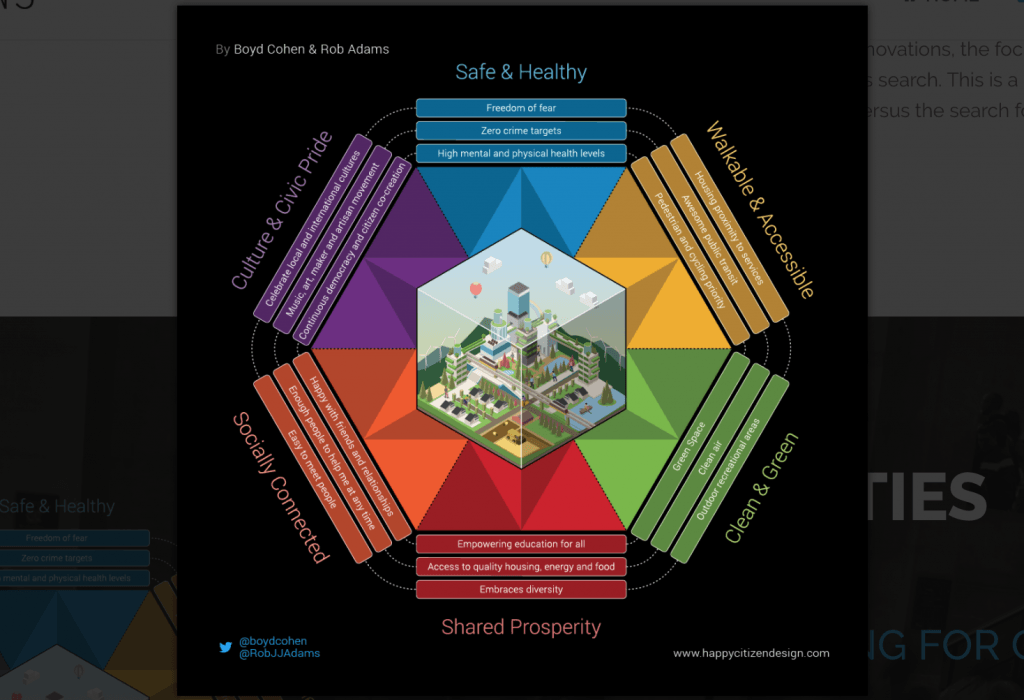 De grote vraag voor Adams en Cohen is: wat zijn de nieuwe metrics van de gelukkige stad? Hoe kan je sturen op geluk? Om de belangrijkste elementen te vangen, hebben ze daarvoor de “Happy citizen hexagon” bedacht, die de belangrijkste drijfveren laat zien: