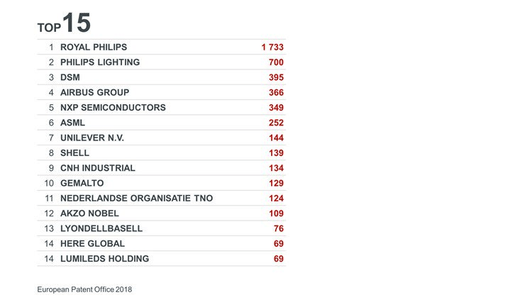In 2016 werden wereldwijd meer dan 3 miljoen octrooiaanvragen geregistreerd, volgens de Wereldorganisatie voor Intellectueel Eigendom, waarvan de meeste uit China, de Verenigde Staten en Japan kwamen. Uit een recente studie van het Europees Octrooibureau (EOB) blijkt echter dat Europa niet ver achterop loopt. In het jaarverslag van het EOB over 2017 staan zes Europese bedrijven in de top 15 van alle octrooiaanvragers, met Philips wereldwijd op de zesde plaats.