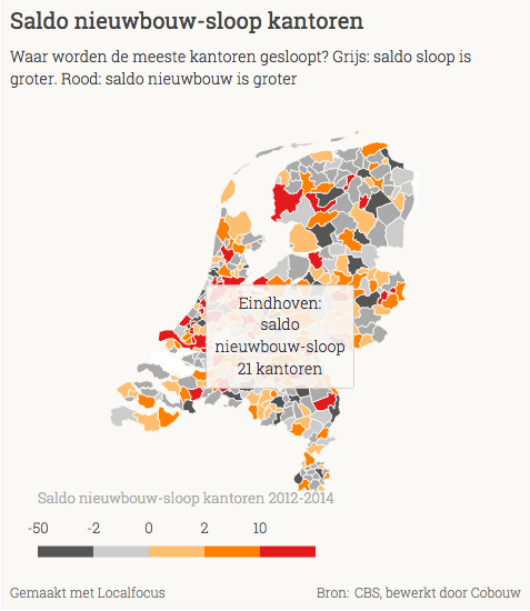 Nederland bouwt meer kantoorpanden dan het sloopt. Voor Eindhoven is het verschil ook groot: er werden tussen 2012 en vorig jaar 21 panden meer gebouwd dan gesloopt. Dagblad Cobouw maakte er, op basis van CBS-cijfers, een mooi overzicht van, met als onderliggende boodschap: “kan dat niet wat beter in verhouding komen?”