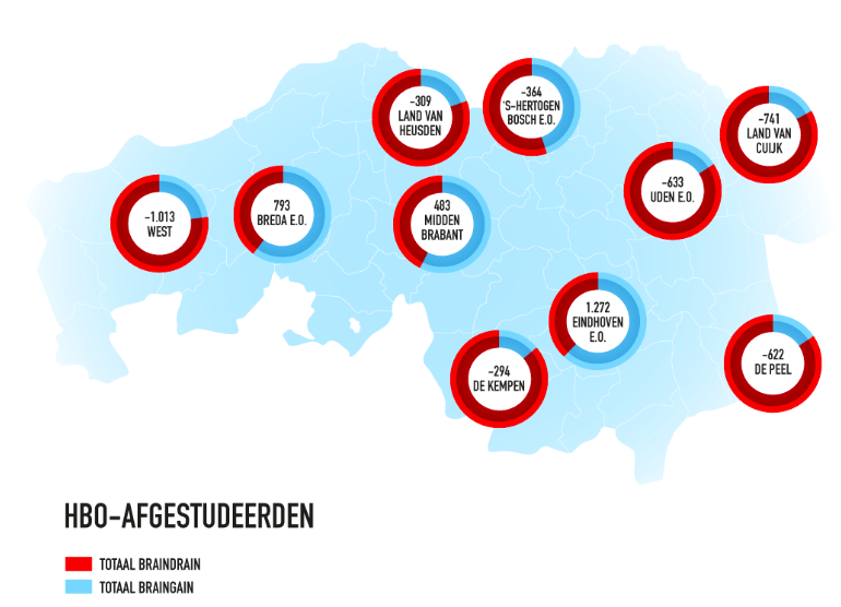 Brabant heeft last van een braindrain: meer afgestudeerden verlaten de provincie dan er blijven of terugkomen. Eindhoven en Tilburg weten zich daar nog enigszins aan te onttrekken, maar de zorgen blijven: de internationale concurrentie – ‘the battle for brains’ – neemt verder toe.