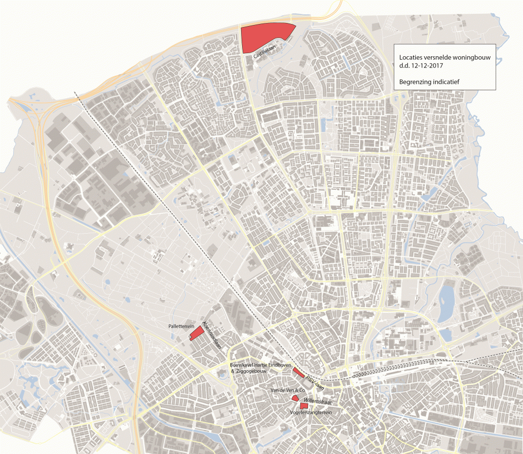 De vier nu gekozen extra woningbouwlocaties zijn in Woensel-Noord het gebied aan de Castiliëlaan (onder meer het voormalige AZC-terrein) en in Strijp het zogenaamde ‘palletterrein’ in Drents Dorp, het Van de Ven & Co-terrein en het Stadionkwartier. Grondgebonden koopwoningen moeten beneden de grens van 3 ton blijven, de huurwoningen zouden tussen de 700 en 1000 euro per maand moeten gaan kosten. Volgens Torunoglu kan daarmee de doorstroming worden gestimuleerd. “Je wilt in de keten eigenlijk drie verhuisbewegingen losmaken, om uiteindelijk de starter goed te bedienen. Daarvoor is deze verdere verfijning noodzakelijk.”