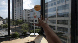 We weten het allemaal: de hele dag zittend computerwerk doen is killing voor je gezondheid. Je lijf verliest vorm en je geest stompt er door af. Maar wat nu als het sturen van een mailtje voortaan alleen maar kan door een basketbal door een ring te gooien? En wat als je je computer alleen maar kunt opstarten met de oplossing van een levensgroot zwevend combinatieslot? Dat zou al wat beweging schelen, nietwaar?