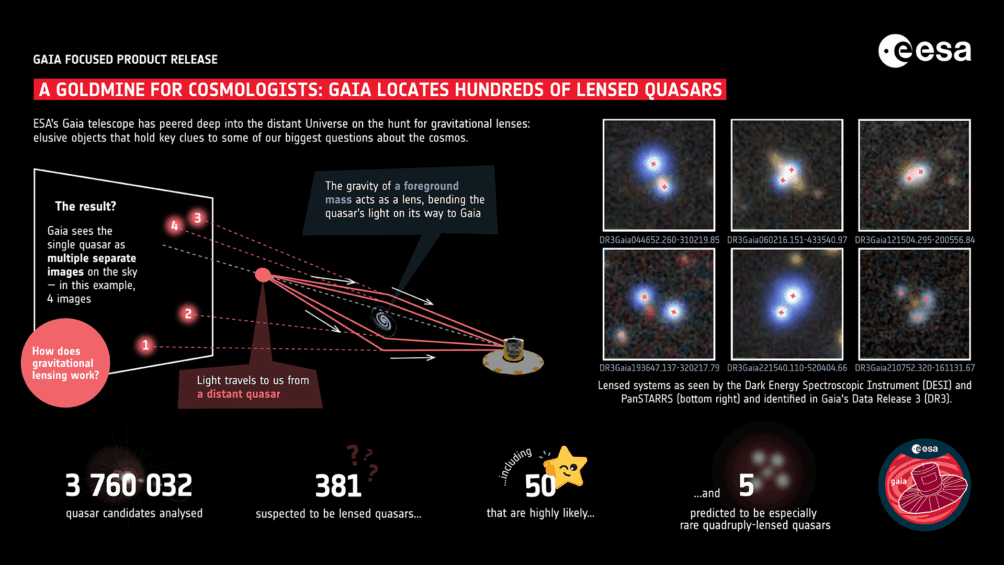 Hoewel Gaia niet is ontworpen voor kosmologie, tuurt ze met haar nieuwe bevindingen diep in het verre heelal, op zoek naar ongrijpbare en spannende objecten die aanwijzingen bevatten voor enkele van de grootste vragen van de mensheid over de kosmos: zwaartekrachtlenzen.